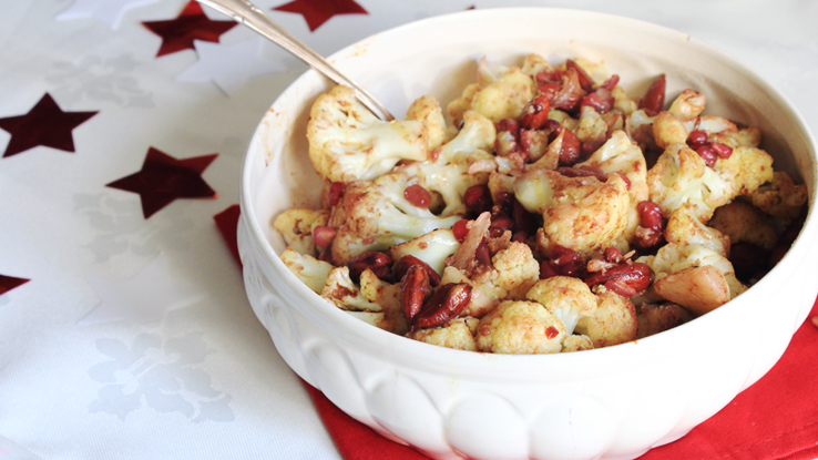 Vandaag een heerlijk kerstig bijgerecht: bloemkool met amandelen en granaatappel! Vegetarisch, gezond en smaakvol. Ideaal voor bij een lekker stuk vis en aardappeltjes.