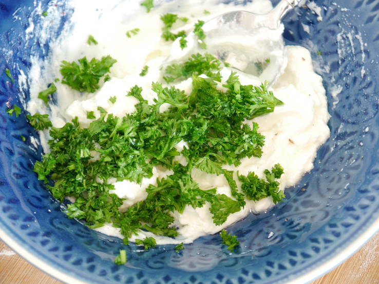 – Hak ondertussen de peterselie fijn en meng met de yoghurt, een flinke snuf peper en zout, en een paar scheuten olijfolie. Zet even weg.