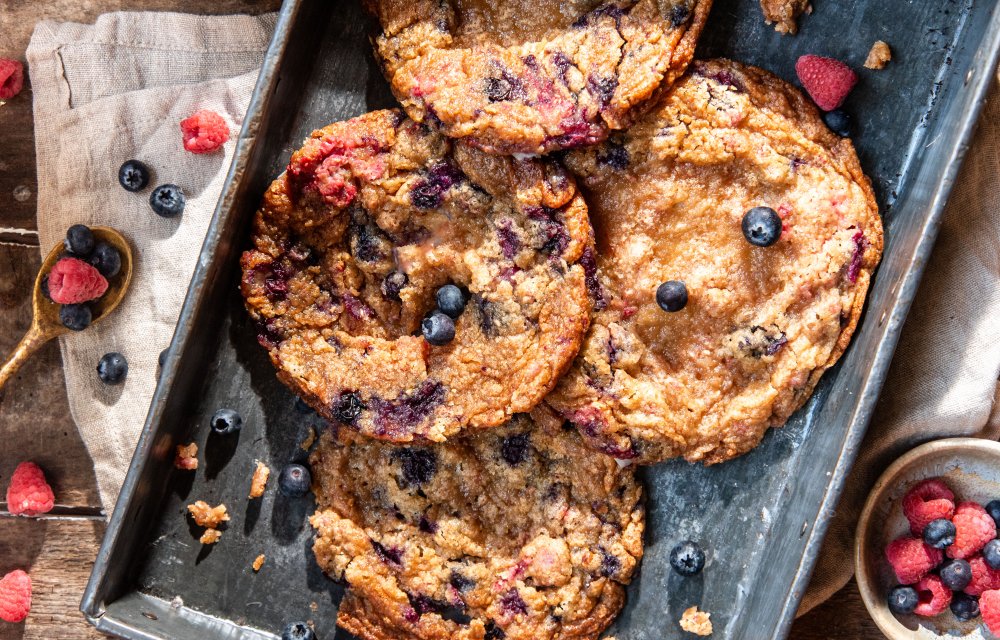 CHICKSLOVECOOKIES. Eerder deelden we al deze beste chocolate chip cookies EVER. Vandaag gaan we eroverheen met deze grote krokante cookies met bosvruchten. En jep, ze zijn echt groot, deze bosvruchtenkoeken: XL, dus! Echt lekker crunchy van buiten, en nog een beetje chewy van binnen. To die for! Ik (Elise) at ze in Frankrijk, en was gelijk geïnspireerd om ze thuis te maken. Hierbij onze variant, dus! Kun je geen verse vruchten meer vinden? Blauwe bessen en frambozen uit de vriezer kunnen ook! Wel even ontdooien dan voordat je ze door het beslag mengt.
