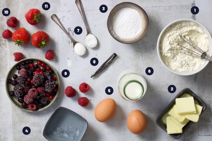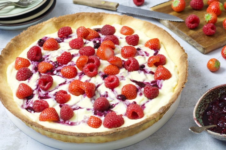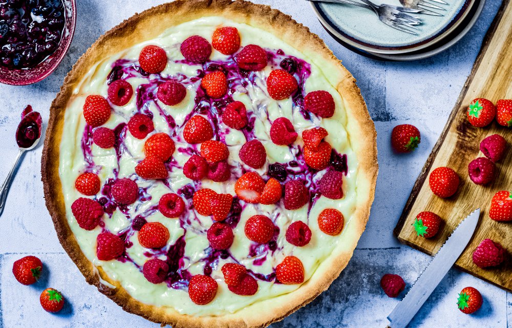 Hmmm, deze zomerse bosvruchtentaart met een bodem van zanddeeg is gevuld met homemade banketbakkersroom en afgetopt met een bosvruchtensaus en verse aardbeien en frambozen.
