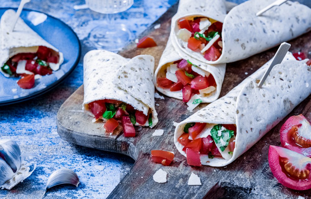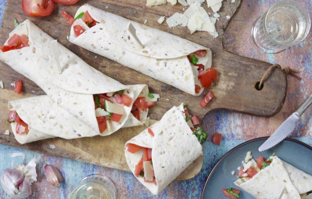 Snel en lekker, dat zijn deze bruschetta wraps. In plaats van tomaat, knoflook en basilicum op een stokbroodje te serveren, stoppen wij ze in een wrap. En om het geheel af te maken, doen we er nog wat Parmezaanse kaas doorheen. Mmm…
