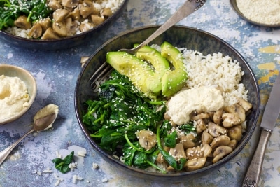 Een goed gevulde kom met diverse kleurrijke groentes, also known as de buddha bowl! Wij vulden ‘m voor deze skinny six met zilvervliesrijst, spinazie, champignons, avocado en hummus.