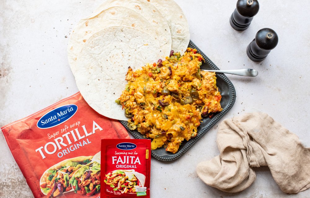 Deze lekkere fajitas bevatten trouwens maar 6 ingrediënten en staan binnen een half uurtje op tafel en de oven doet het meeste werk. Oók al zo fijn als je doordeweeks aan het koken bent, dan heb je vaak gewoon niet zoveel tijd! Naast jalapeño’s gebruiken we Mexicaanse groenten, geraspte cheddar kaas en verder de zachtste tortilla’s die we kennen (van onze partner Santa Maria, echt de beste!) en een heerlijke kruidenmix: Santa Maria Fajita seasoning mix.