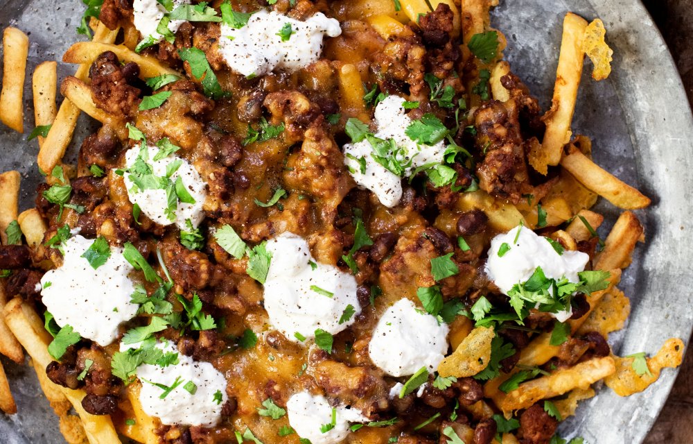 Dit is comfort food zoals comfort food moet zijn: cheesy, crispy en makkelijk. Deze chili fries maak je met ovenfriet en zelfgemaakte chili van tomatenpuree en kidneybonen. De gesmolten cheddar, zure room en verse koriander on top maken het helemaal af.