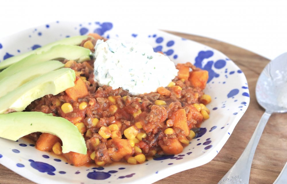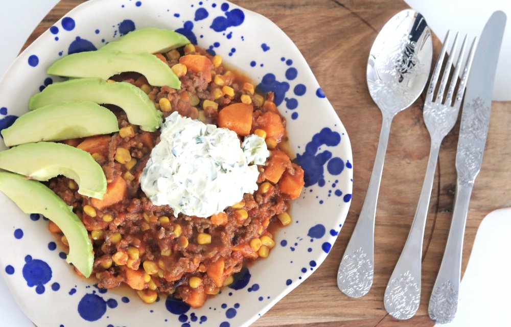 Dus vandaar hierbij vandaag een chili sin bonen, maar met zoete aardappel en gehakt. Echt het proberen waard, zo met die romige crème fraîche!