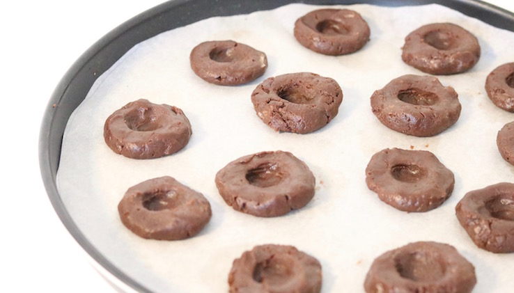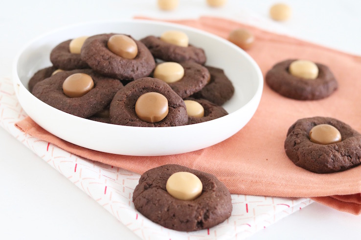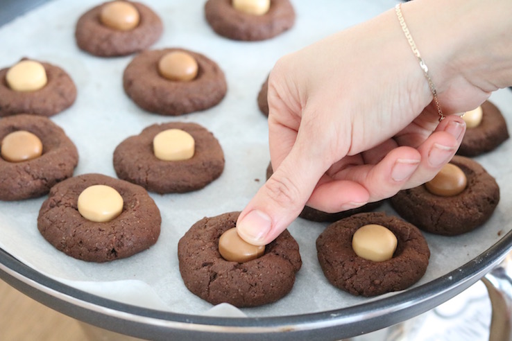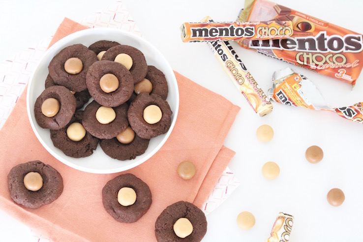 Ik heb chocolade duimkoekjes gemaakt. Wat eigenlijk gewoon lekkere koekjes zijn met een ‘duimafdruk’ erin, en in dat deukje kun je wat lekkers leggen. Ditmaal zijn dat de nieuwe Mentos Choco & Caramel.