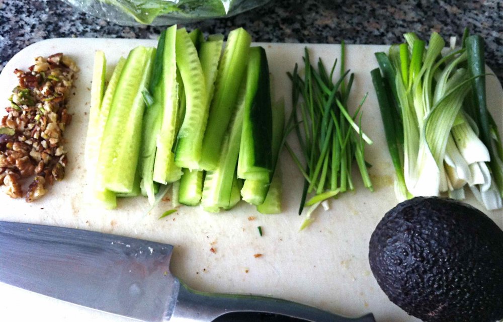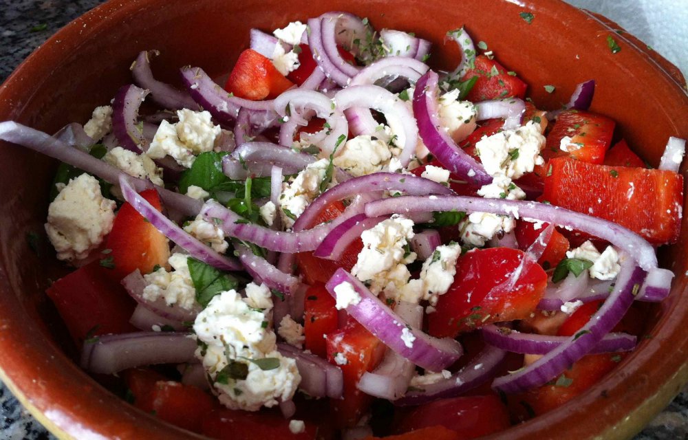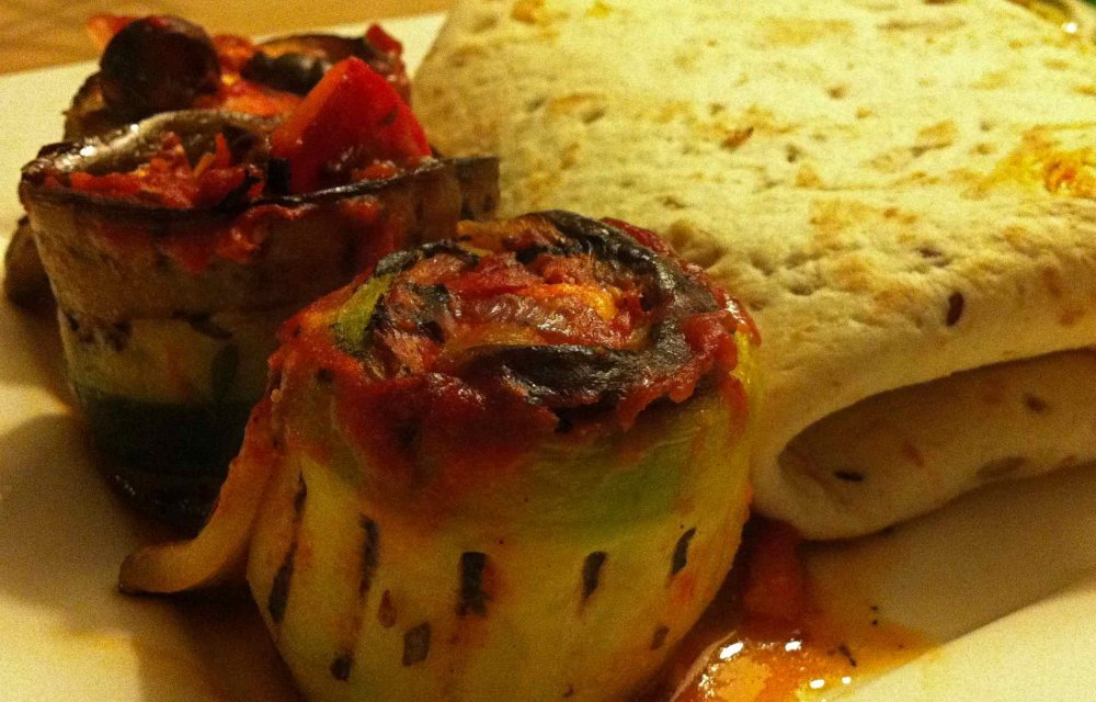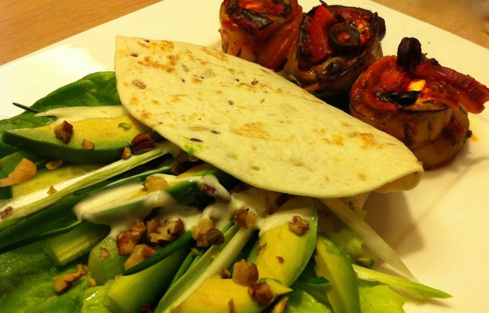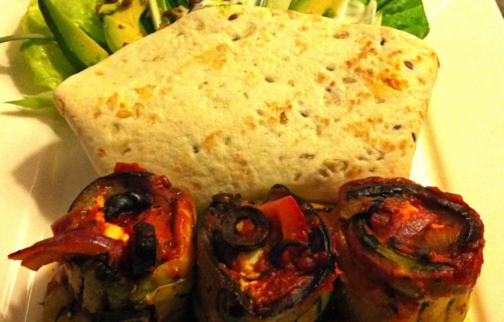 Courgette/aubergine rolletjes met feta en een groene salade-wrap