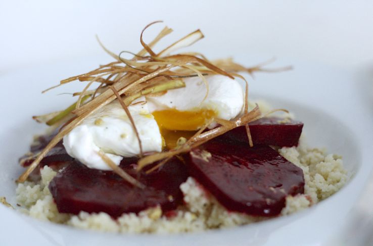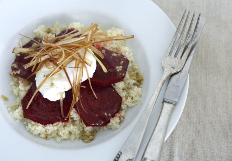 Toen ik vorige maand 30 werd, heb ik een dinerparty georganiseerd voor 30 man. Kan je niet gemist hebben toch? Zo wel, bekijk hier de vlog van deze heerlijke avond! Samen met mijn kookhomie Ivo bereidde ik een 7-gangendiner met bijpassend wijnarrangement. Onder andere mijn studievriend Sander vroeg me of de recepten nog online kwamen, omdat het zoo lekker was 🙂 Nou hierbij San! Een van de toppers van die avond was het voorgerecht: ovengegaarde biet met gepocheerd ei, krokante prei en mosterdvinaigrette. Zelfs mijn vlees-etende vriend was lyrisch over dit vega-gerecht. Dus maakte ik het nog eens thuis maar dan als diner met couscous.