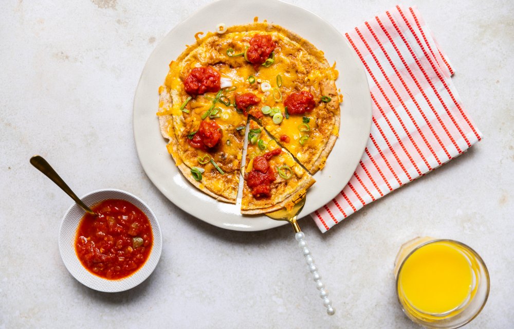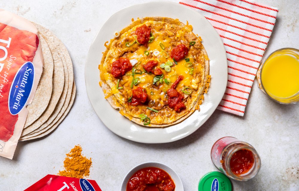En ook heel fijn: je hebt maar 6 ingrediënten nodig en weinig afwas! Je kent ons toch ;-). Zo maken we ‘m: we kloppen eitjes los met Santa Maria taco kruidenmix, dan wéét je al dat je gerecht bomvol smaak zit, en kleden het eimengsel verder aan met geraspte cheddar en bosui in ringetjes. Dat giet je in de pan en dan doe je er meteen een tortilla op (die van Santa Maria zijn onze favoriet). Even bakken, omdraaien en nog wat cheddar, bosui én Santa Maria chunky wrap salsa. Het resultaat? Een heerlijke crunchy Tex Mex omelet, dus een fluffy omelet bomvol smaak met dus een knapperige onderkant. Zalig, probeer maar eens!