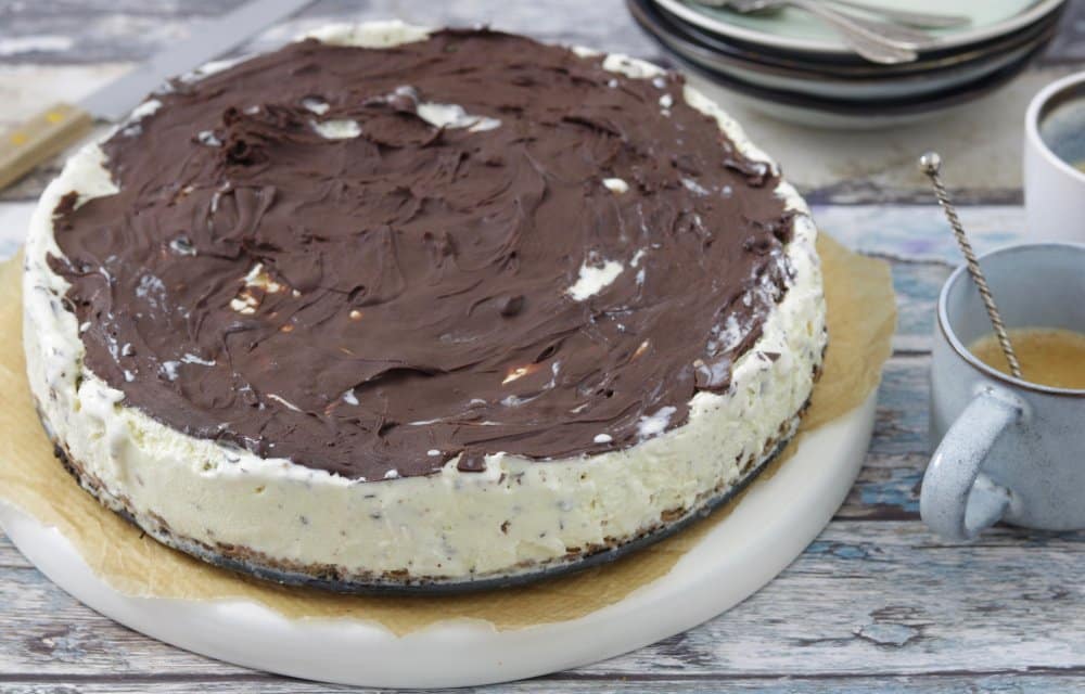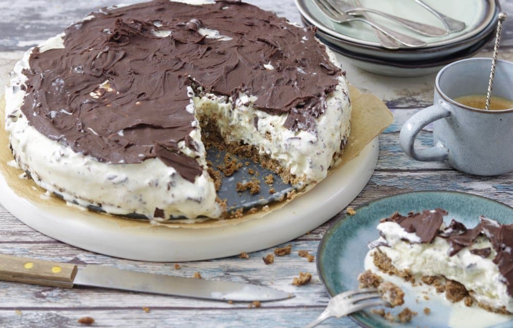 Wie is er niet dol op de traditionele dame blanche? Heerlijk vanille roomijs met warme chocolade. Als je dat al lekker vindt, dan zal het water al helemaal in je mond lopen van deze dame blanche taart met een bodem van Bastognekoekjes. Oh yes!