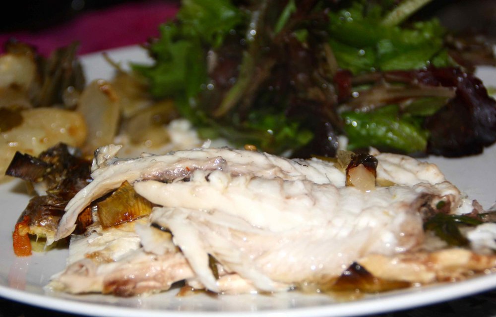 Vis in een schaal, wat smaakmakers erin en eroverheen en klaar is vis van Cees 🙂