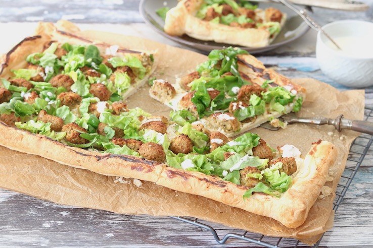 We kunnen het niet vaak genoeg zeggen: plaattaart is fantastisch!  Of je nu een Griekse spanakopita plaattaart  of je een plaattaart met Hollandse spruitjes maakt, plaattaart is gewoon altijd goed. Het zal je dan ook niet verrassen dat we vandaag weer een plaattaart op het menu hebben staan. Deze vegetarische falafel plaattaart is heerlijk als lunch of diner, snel en maak je met maar 5 ingrediënten.