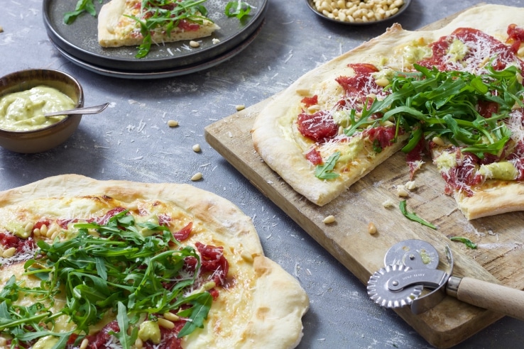 Toe aan wat anders dan de ‘gewone’ pizza? Maak dan eens deze look-a-like! Deze flammkuchen heeft een dunne, homemade bodem met daarop een smeuïg laagje van crème fraîche. Topping erop en klaar!