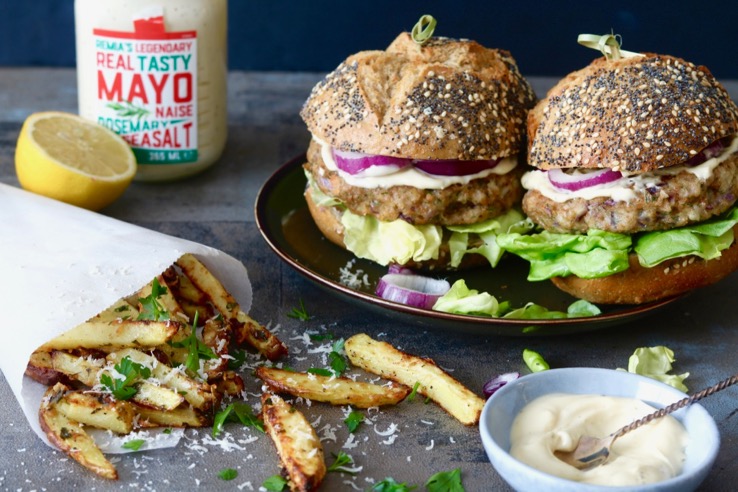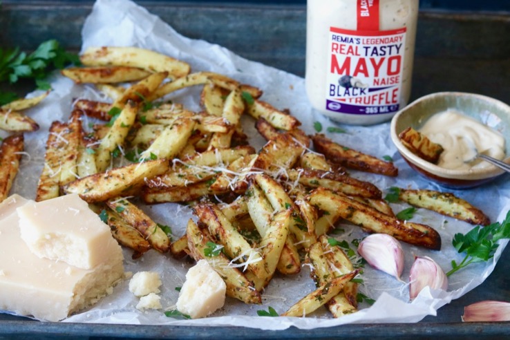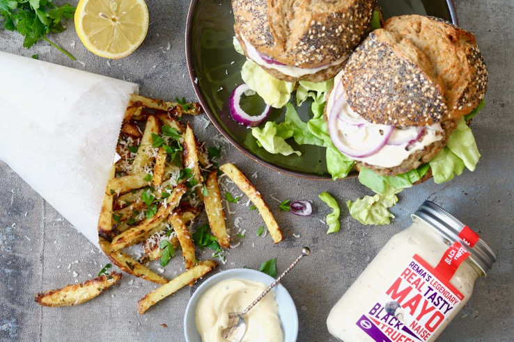 We maken dit recept met de verrassende Legendary Mayo van Remia in de smaken black truffle en rosemary-seasalt. Zo’n romige klodder mayo on top maakt dit comfort food helemaal af. Moet af en toe kunnen, toch? Zeker met het weekend voor de deur! Je hebt beiden recepten misschien al op Instagram voorbij zien komen, maar hier komen ze nog een keer onder elkaar. You’re welcome! 😉