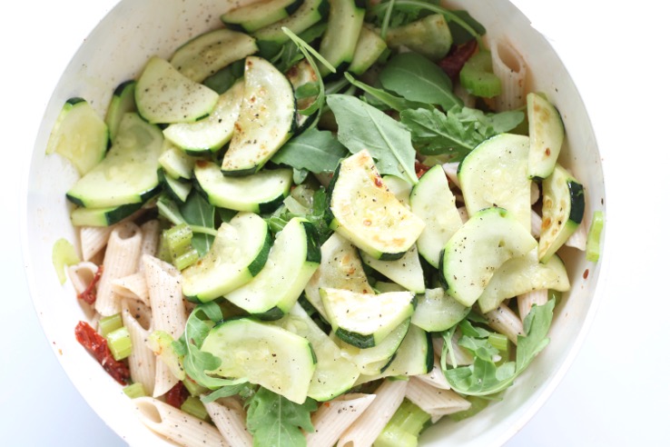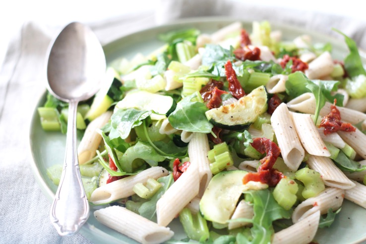 Tijdens onze vakantie in Nederland hebben wij 3 weken lang niet gekookt. Haha. Écht. Zowel lunch als diner haalden we af of lieten we thuis bezorgen. Zo haalde ik een middag een salade bij de Italiaanse traiteur met gegrilde courgette, bleekselderij en zongedroogde tomaatjes. Té lekker!