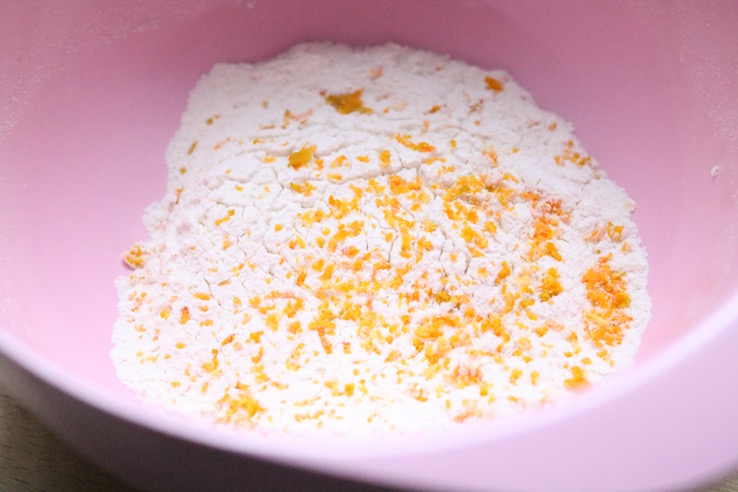 – Rasp de schil van het mandarijntje en roer ook door de bloem.