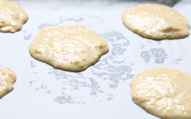 – Verdeel het beslag in vijf hoopjes op een met bakpapier beklede ovenplaat en schuif in de oven.