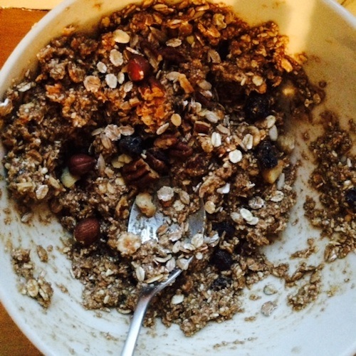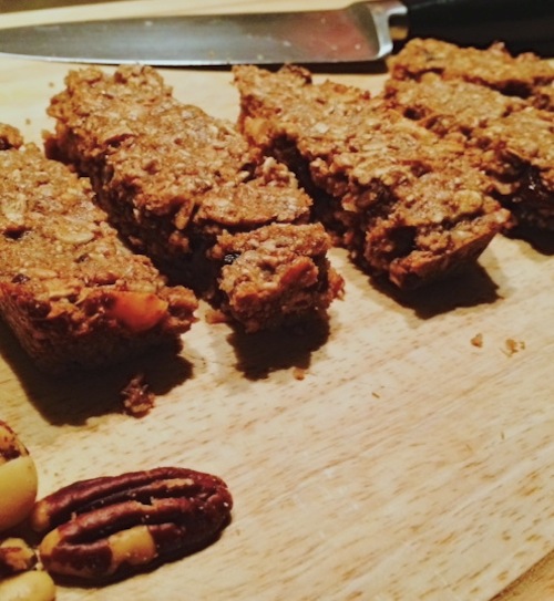 Granola eet je door de yoghurt als ontbijt en is een mengsel van haver, noten en honing, gebakken tot krokante stukjes. Of als repen, zoals hier!