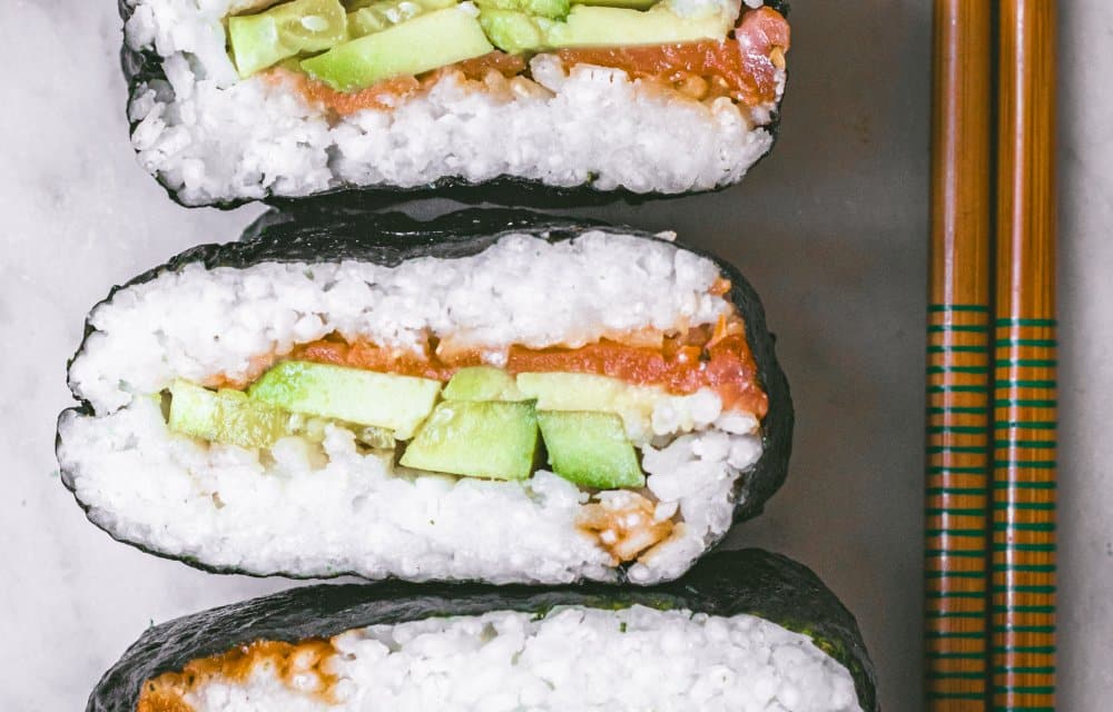 Gezonde sushi sandwich (onigirazu) met 6 ingrediënten
