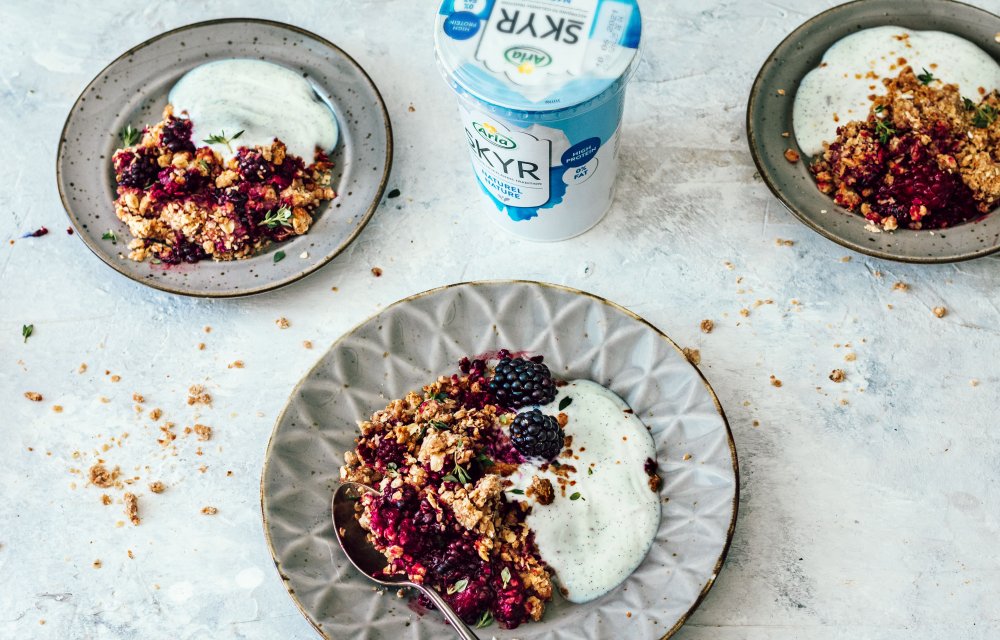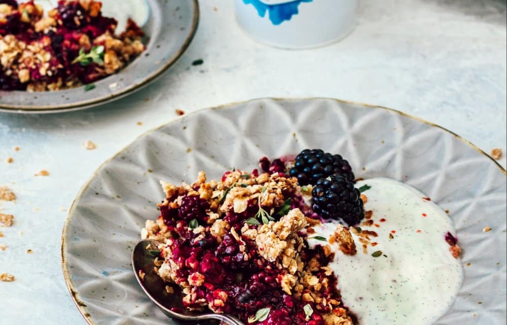 Gesponsord – Yes, gezondere bramencrumble! Het deeg maken we van speltmeel, havermout en kokosolie. De bramen en blaadjes tijm geven er een heerlijk diepe smaak aan, die perfect aansluit bij het romige yoghurtmengsel. Dat mengsel maak je met Arla Skyr 0% naturel; een frisse en stevige IJslandse stijl-yoghurt boordevol eiwitten. Voeg daar honing en vanille aan toe en that’s it! Enne… deze gezondere bramencrumble kun je natuurlijk ook heel goed als ontbijt serveren!