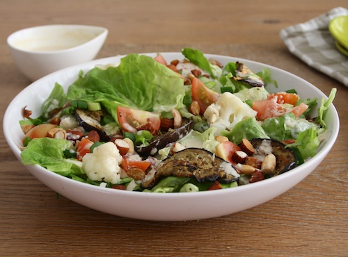In de zomer eet ik elke dag wel salade: of als hoofdgerecht of erbij. Nu moet ik uitkijken dat ik niet elke dag deze dressing over de salade giet, want het is mijn absolute favo van dit moment. Deze romige, smaakvolle dressing maakt echt alles lekker! Heerlijk over een spinazie-salade. Of over gegrilde groenten, zoals bij deze salade.