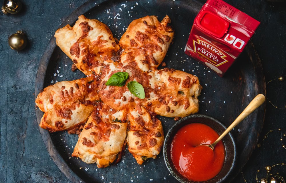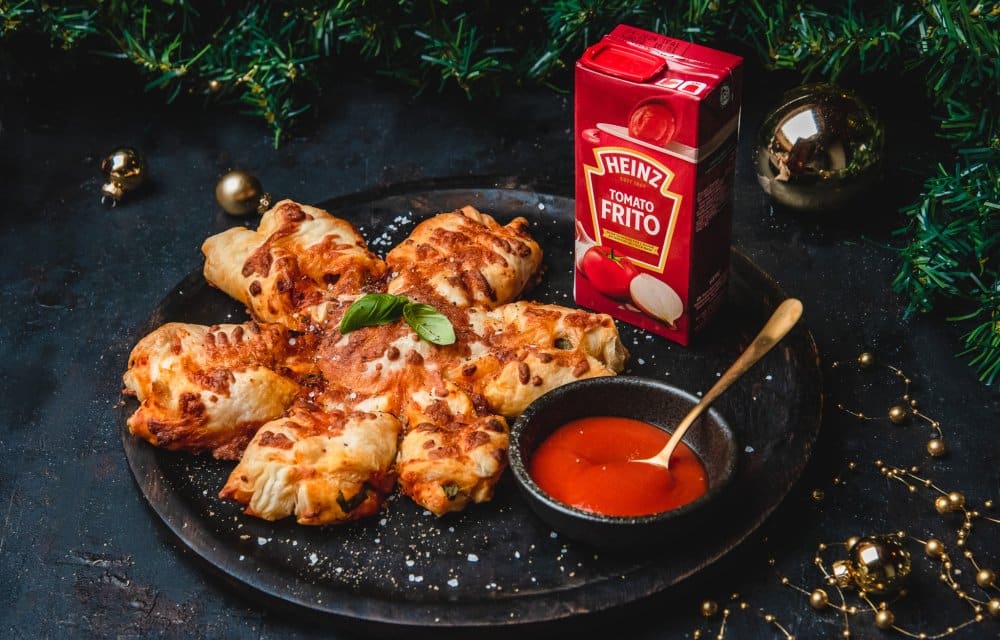 Wij gebruiken ten eerste in deze fijne hartige kerstster Heinz Tomato Frito, en dat proef je! Deze saus bevat 100% zongerijpte tomaten, waardoor dit kerstgerecht simpelweg mega smaakvol is. Doe daar vervolgens nog wat verse basilicum, mozzarella en tenslotte wat salami bij en je hebt een échte allemansvriend op tafel. Heerlijk voor bij de borrel.