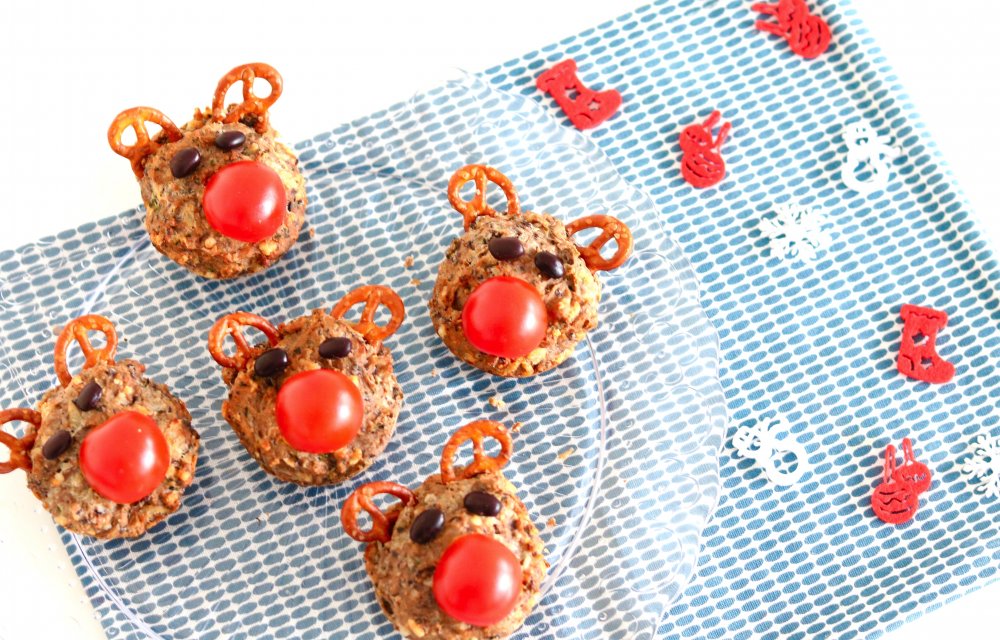 Deze kidsproof Kersttraktatie zien er niet alleen schattig uit, ze zijn ook érg lekker. Je maakt deze hartige muffins met onder andere fijngemalen bonen en courgette. Gezonde kleine Rudolphs met verstopte groenten, compleet met “very shiny nose” 😉