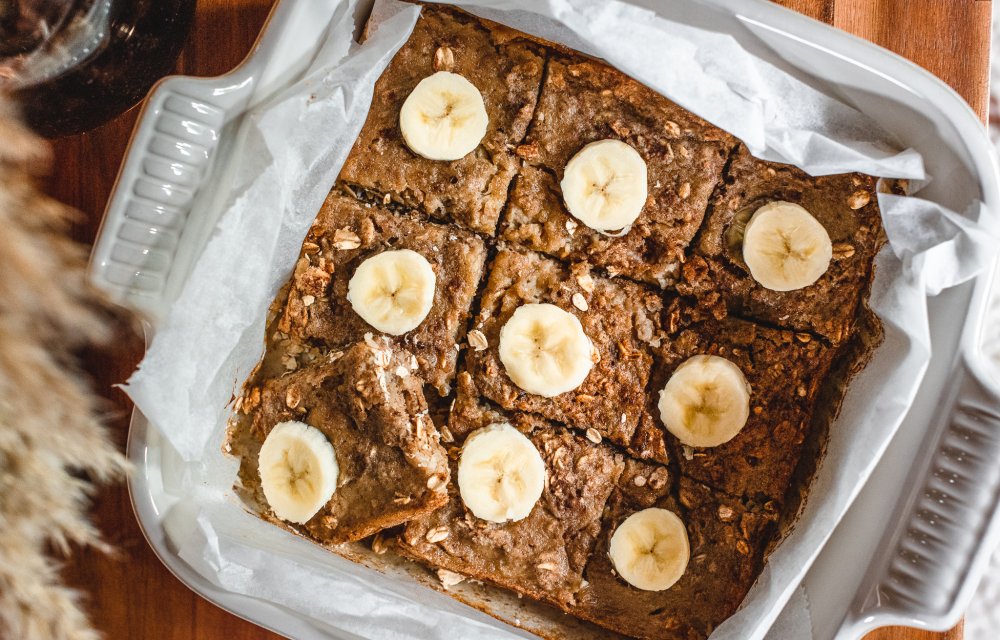 Het maken van deze haverkoek traybake is zo gepiept. Je moet er wel even een uurtje voor uittrekken voor -ie voor je neus staat, al zijn 45 minuten daarvan oventijd. Het enige wat je hoeft te doen, is alle ingrediënten met elkaar mixen in de blender. Vervolgens verdeel je dit beslag over een bakvorm en bakken maar! Laat ‘t daarna even afkoelen, snijd ze in 16 stukken en voilà, je gezonde ontbijt is klaar!