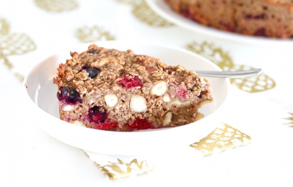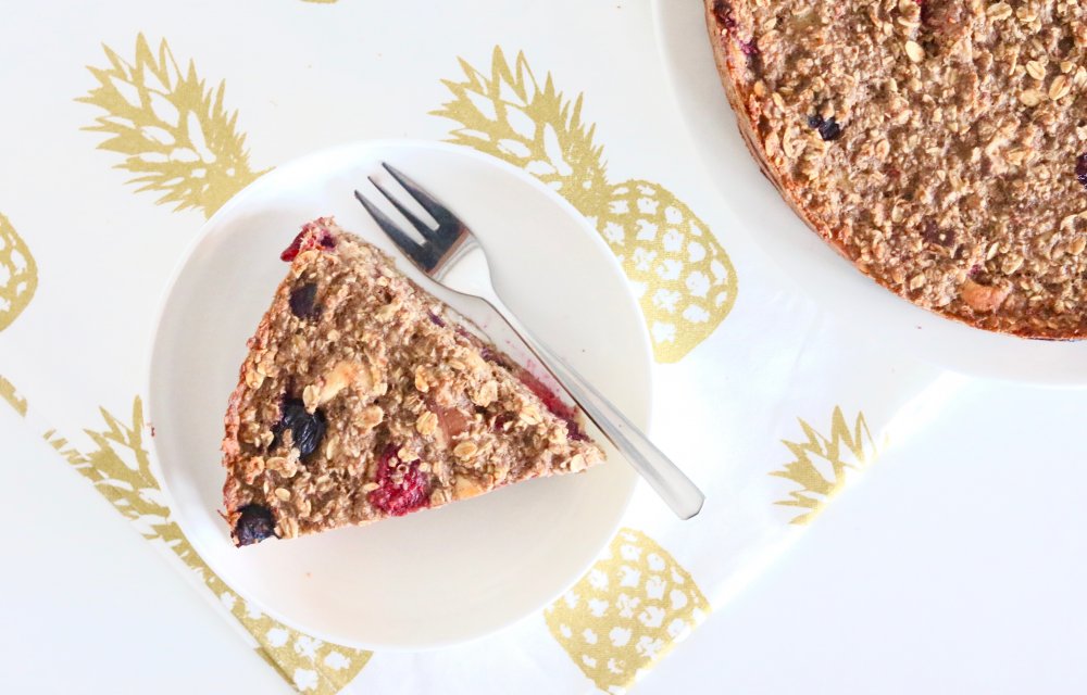 De taart is heerlijk chewy, vullend en healthy. Perfect als ontbijt, maar zo lekker dat je als tussendoortje gewoon weer een stukje wilt. En dat terwijl het recept zo simpel is. Wij gebruikten een combinatie van havermout en havervlokken, maar je kunt ook alleen havermout gebruiken. Verwen jij jezelf dit weekend met een stukje taart (of twee ;-)) bij het ontbijt?