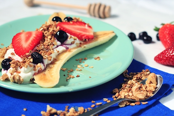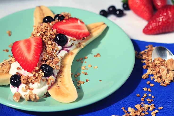We kennen hem allemaal wel: de bananensplit. Wij vonden het de hoogste tijd voor een gezonde variant die je kids ook gewoon met het ontbijt kunnen eten. Zo is de eerste maaltijd van de dag een feestje! Binnen no time staat dit spectaculaire ontbijtje op tafel. En vergeet vooral niet om er ook een voor jezelf te maken! 🙂