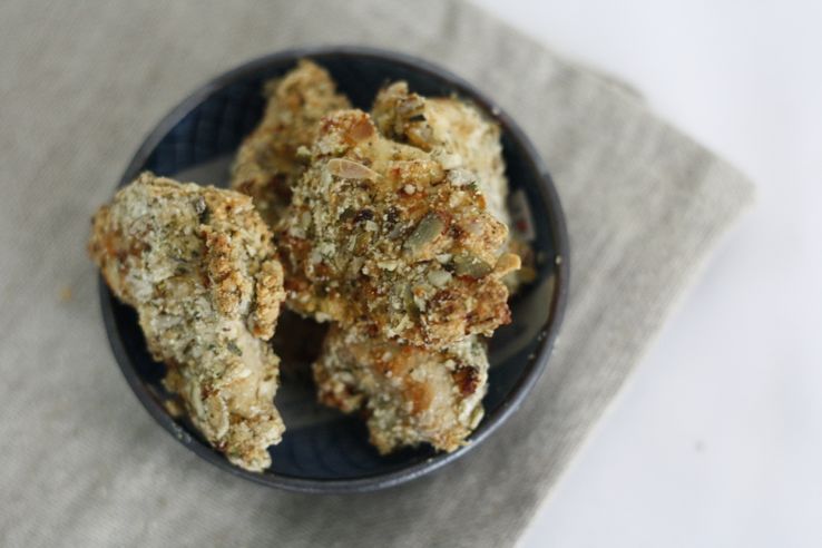 Ik maak namelijk een krokant jasje van amandelmeel, pompoenpitten en zonnebloempitten. En vervolgens bak ik ze in de oven. Echt healthy dus. Komen ze!