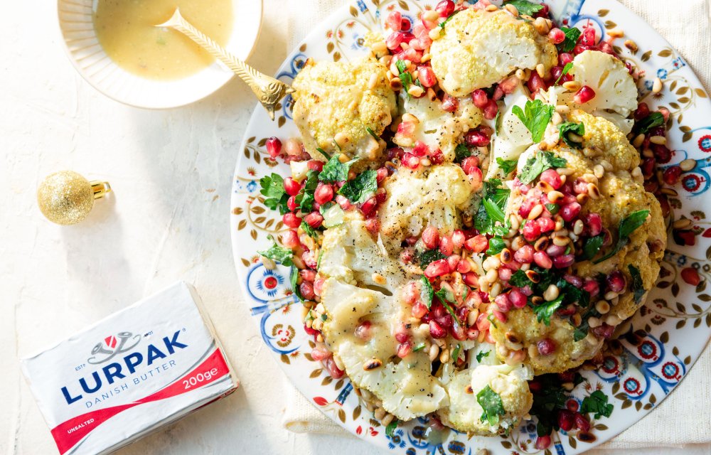 Gesponsord – Oh hallo, perfect bijgerecht (of zelfs hoofdgerecht!) voor Kerst. Kijk nou, wat een pláátje! We hebben een heerlijke Hollandse bloemkool ingesmeerd met zo’n beetje het lekkerste botermengsel wat je kunt bedenken: boter met vadouvan-kruiden. En die bloemkool gaat de oven in. Dit is een hele bloemkool uit de oven met vadouvan-boter, dus! En niet zomaar boter, nope, we gaan voor Lurpak® ongezouten roomboter. De boter zorgt voor een ontzettend lekkere, malse bloemkool. Die ook nog eens barst van de smaak door de vadouvan, maar óók doordat we ‘m afmaken met nog meer van die lekkere boter (uit het kookvocht), én tahin. Waardoor dit gerecht een smaakexplosie wordt! Voeg daar nog wat peterselie, granaatappelpitjes en citroen aan toe en je hebt een heerlijk Hollands kerstgerecht mét Midden-Oosterse twist.