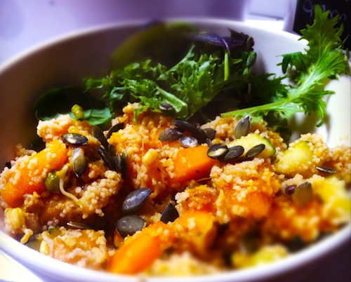 Deze couscous is herfstproof door de pompoen, pompoenpitjes en pittige salade melange.
