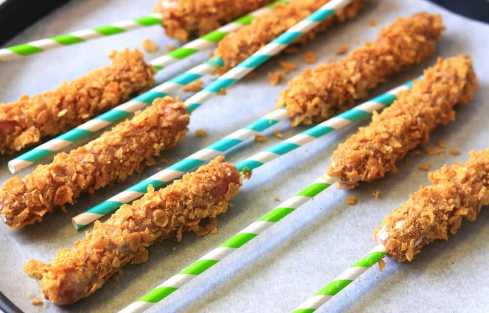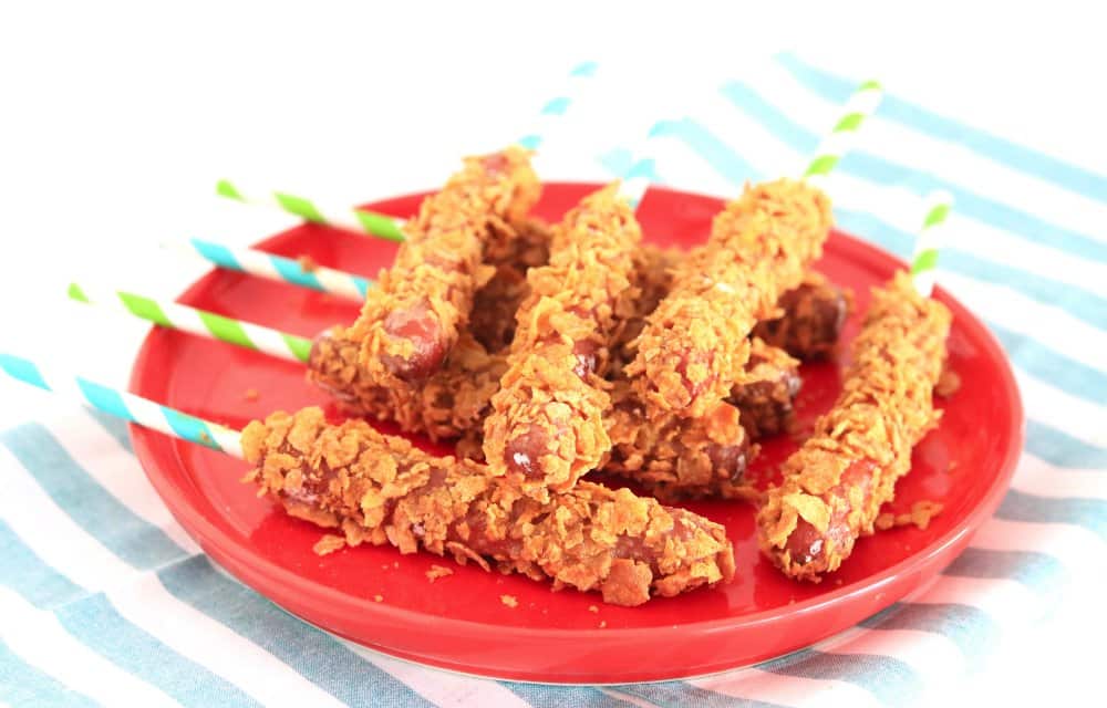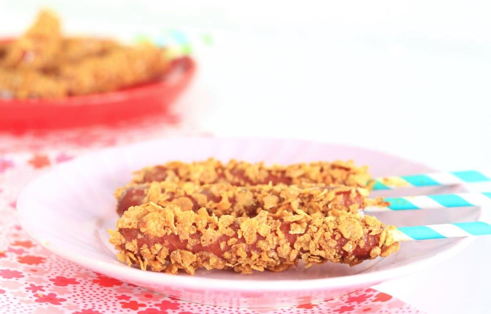 Gepaneerde hotdogs met een knapperig cornflakes laagje, die een beetje doen denken aan de Amerikaanse corndogs. Perfect voor op een kinderfeestje of gewoon als fijne snack!