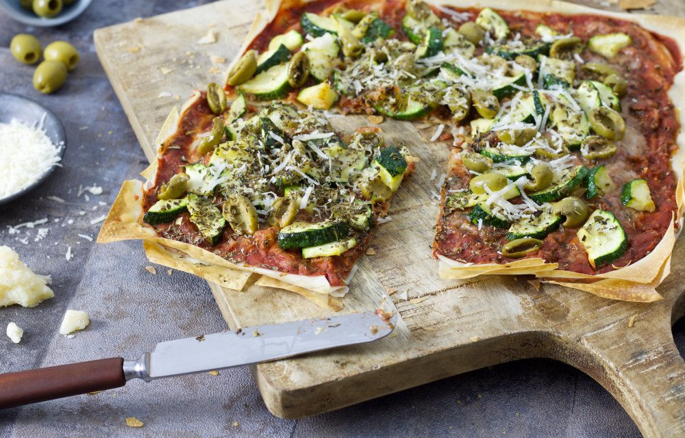 Filodeeg is heel geschikt als pizzabodem! Het is lekker knapperig en niet te zwaar, zodat de aandacht naar alle lekkere ingrediënten erop gaat. Deze Italiaanse filodeegpizza met courgette, olijven en Parmezaanse kaas heeft een skinny imago én is in een handomdraai gemaakt! Easy does it!
