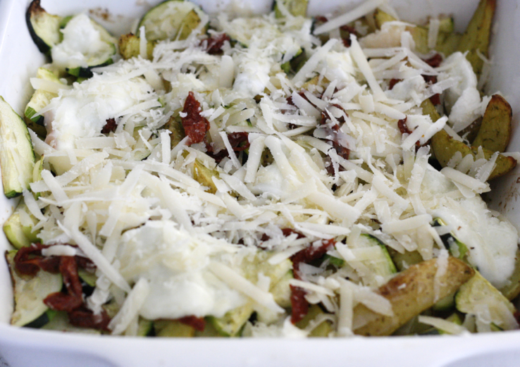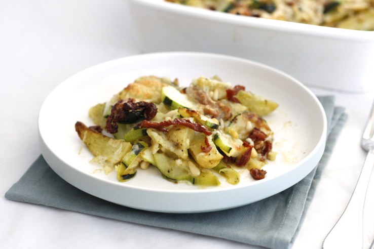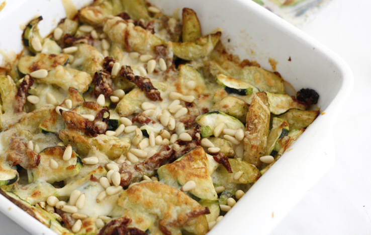 Het liefst eet ik de laatste tijd elke dag pasta met een bol buffelmozzarella en een lading Parmezaan. Het liefst eet mijn vriend elke avond gebakken aardappels als diner. Partjes met schil en veel kruiden, dat zijn z’n favo’s. Dus ik dacht, laat ik onze favorieten eens combineren in een ovenschotel!