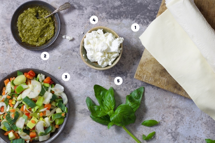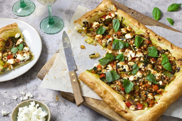 Tijd voor plaattaart! Pure verwennerij met dit makkelijke, snelle gerecht met een bodem van bladerdeeg en een topping van pesto, Italiaanse groenten, romige feta en basilicum.