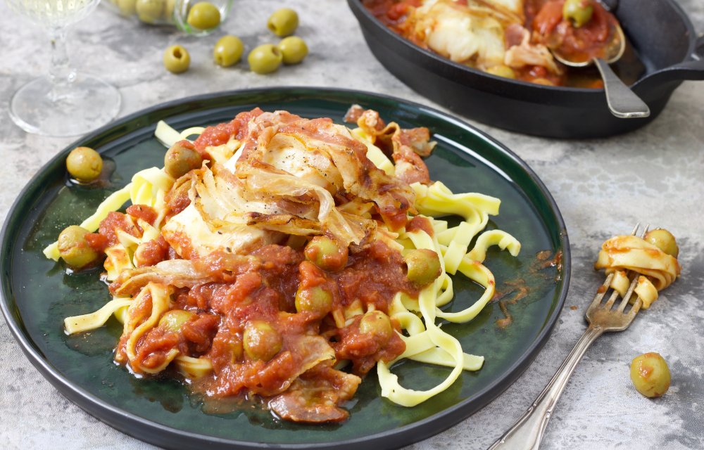 Visliefhebber? Dan vind je deze kabeljauw uit de oven vast een topper. Met maar 5 ingrediënten en binnen 20 minuten smul je van deze vis met knapperige pancetta, olijven en tomatensaus. Op een bedje van verse tagliatelle!
