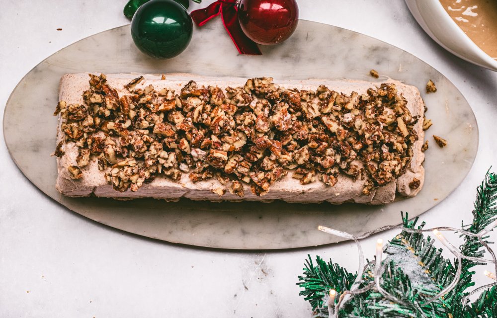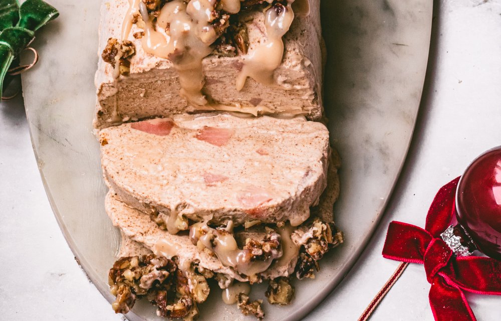 Wat we zo heerlijk vinden aan dit dessert, is dat het echt alles heeft wat je met kerst wilt. Romig ijs met een vleug kaneel, zoete stoofperen, knapperige pecannoten en een warme witte chocoladesaus die eroverheen smelt zoals sneeuw in een kerstfilm. Ook de bereiding is verrassend simpel. De basis is namelijk ijs zonder ijsmachine: slagroom kloppen, gecondenseerde melk erdoor, wat kaneel erbij, stoofpeertjes erdoorheen, in een vorm gieten… en de vriezer doet de rest.