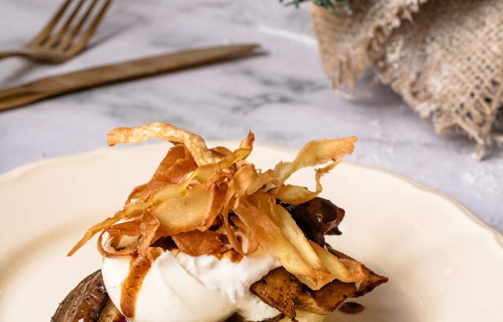King oyster mushrooms met burrata, balsamico-ui en pastinaakpuree (kerst hoofdgerecht)