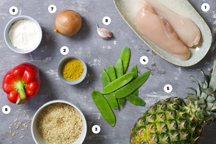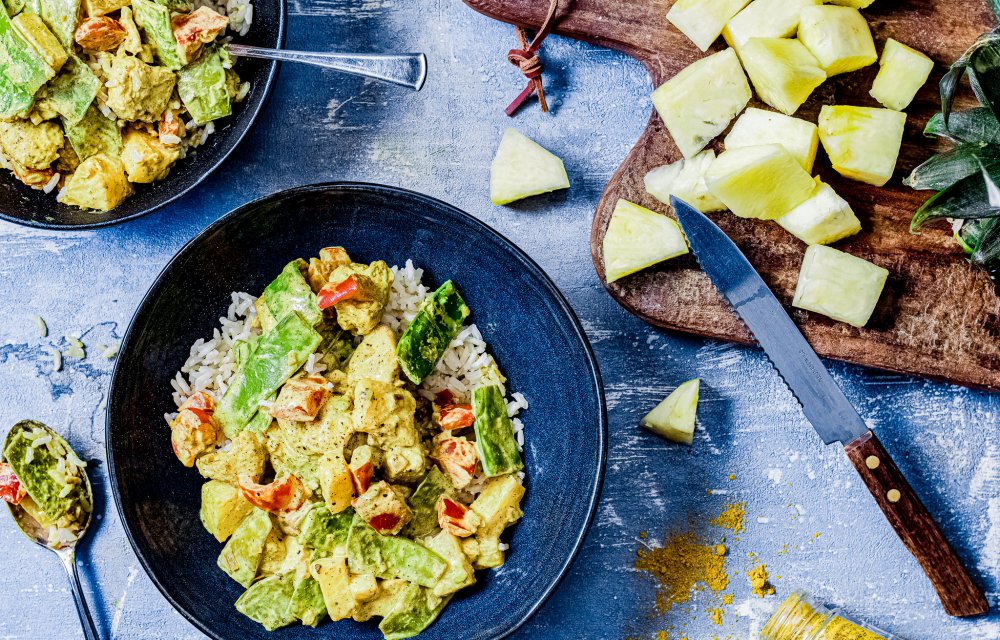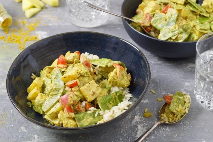 Och, we hebben weer een heerlijke maaltijd die je helemaal zelf maakt: kip-kerrie met rijst! De romige kerriesaus past perfect bij de knapperige groentes.
