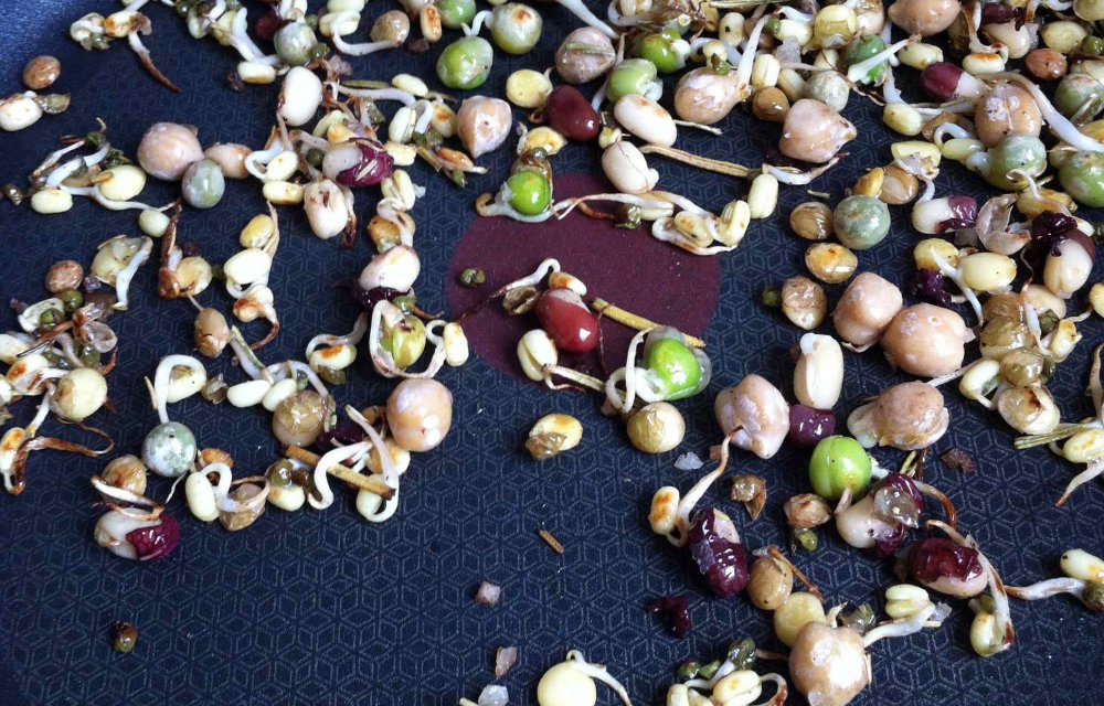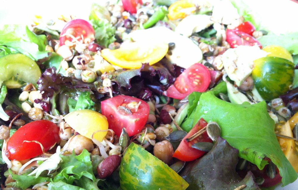 Deze salade stond dan ook in een paar minuten op tafel. Kleurrijk is ‘ie zeker, en zeer origineel en verrassend door het gebruik van Sprouty, verschillende soorten tomaatjes en zelfgemaakt rozemarijn-zout. Komt ‘ie dan, he!