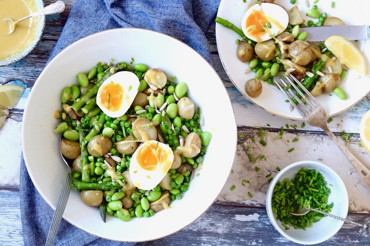 Wij hopen dat de zon lekker schijnt als je deze krieltjessalade met doperwten, asperges en edamame gaat maken. Binnen 20 minuutjes staat hij op tafel: echt een snel, makkelijk en lekker recept voor de zomer. De krieltjes worden gebakken met schil en daardoor hebben ze een heerlijke bite. Nog een gekookt eitje en wat dressing on top en je bent helemaal klaar voor je lunch of diner in het park.