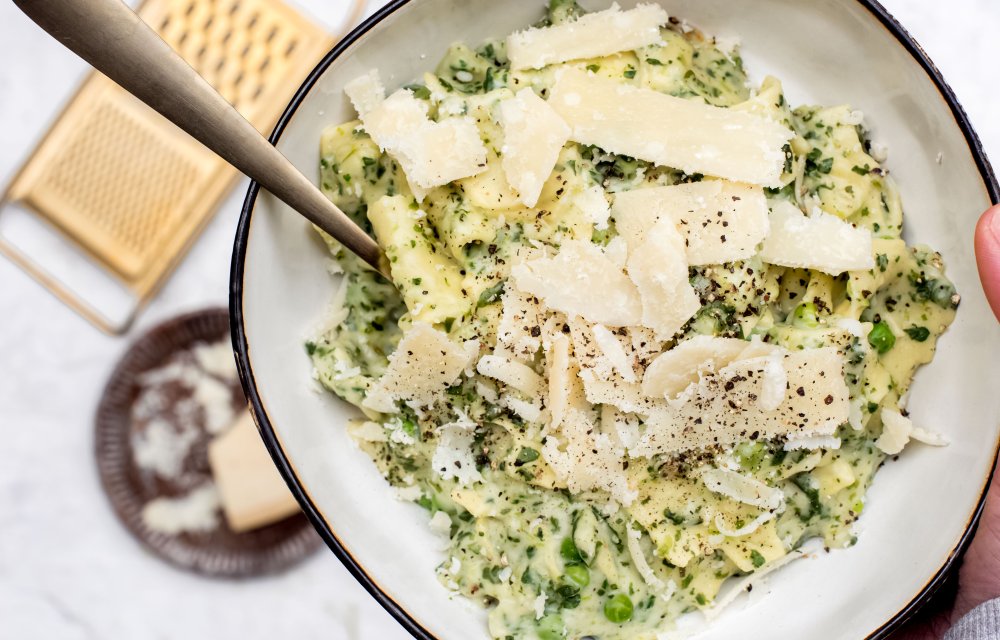 Oké, en nu even door naar het recept. We maken vandaag een lasagne uit de pan. Lekker makkelijk, je hebt nauwelijks afwas. Ditmaal gaan we niet voor een klassieke rode saus, maar maken we een bechamelsaus en houden we de lasagne verder lekker lente-achtig met spinazie en tuinerwtjes en wat citroenrasp. Aanrader!