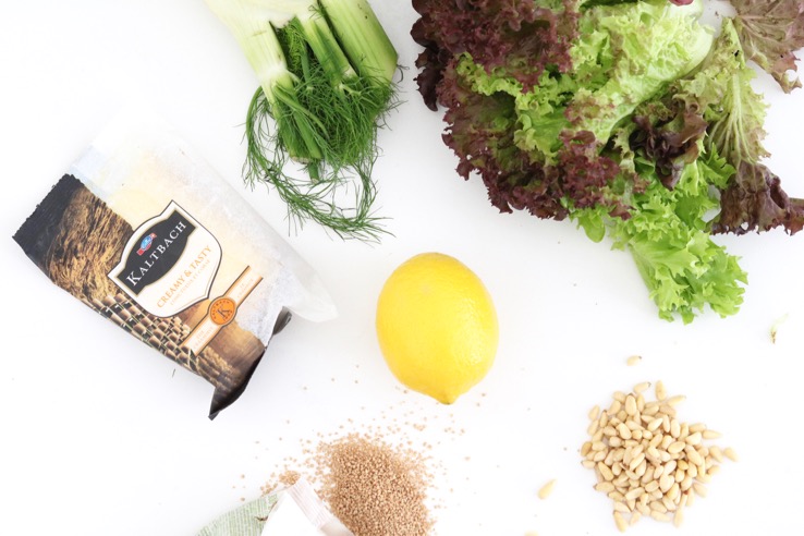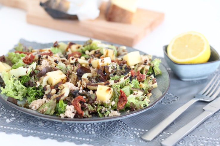Als kaas heb ik gekozen voor de Emmi KALTBACH Creamy. Deze kazen worden in de Kaltbach grot gerijpt waar het klimaat perfect vochtig is voor natuurlijke kaasrijping en waardoor -ie zo’n karakteristieke smaak krijgt. Zo’n kaasje maakt deze salade met herfstig tintje helemaal af!