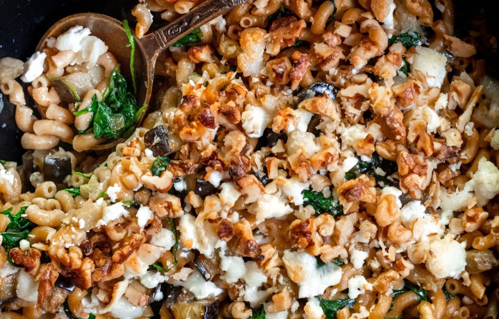 Er zijn nooit genoeg pastarecepten, toch? Daarom delen we vandaag deze macaronischotel met geitenkaas met 5 ingrediënten. Helemaal vega, want je maakt ‘m van aubergine, spinazie en walnoten.