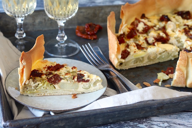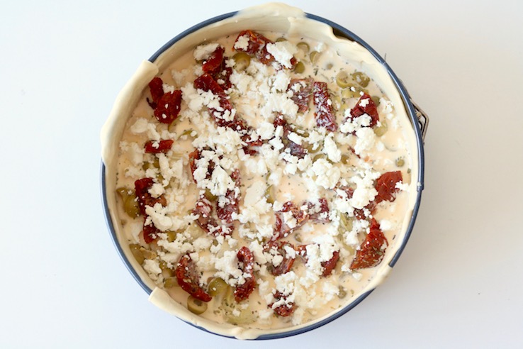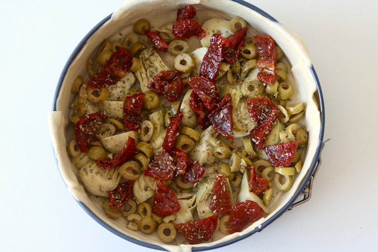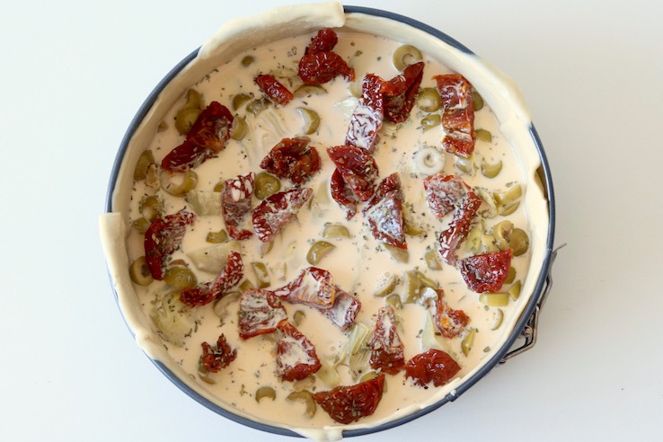 Vandaag hebben we weer een nieuwe variant voor een hartige taart voor je! Vorige keer maakte we een hele simpele spinaziequiche, maar deze keer gaan we voor een mediterraanse smaaksensatie. Daarom voegen we zongedroogde tomaatjes, olijven, artisjokharten, oregano en feta toe.