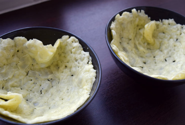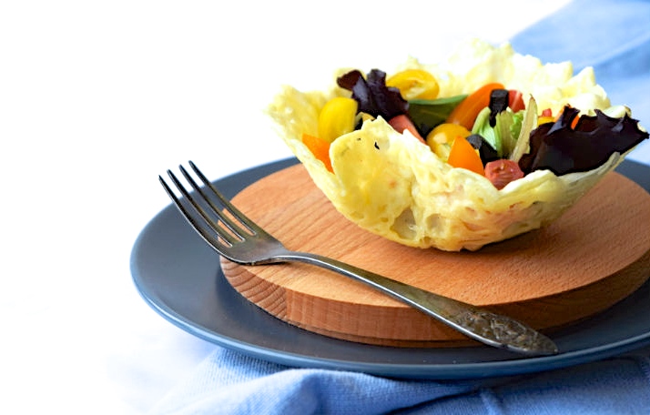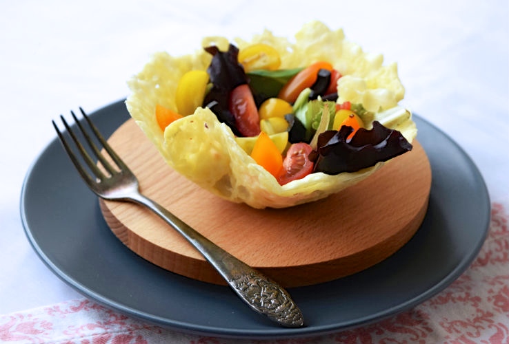 Dit eetbare saladebakje is gemaakt van parmezaanse kaas. Ik maakte het zelf als voorgerecht tijdens een diner voor de hele family en iedereen was blij verrast :-). Echt een keer maken dus, deze kaasbakjes!