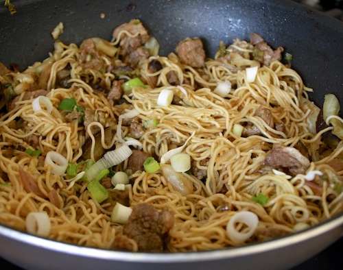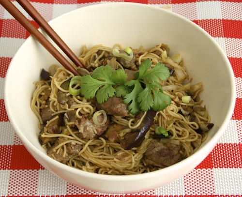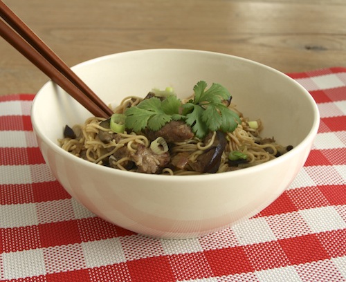 Weer eens wat anders: noedels met gewokte aubergine en stukjes vlees.