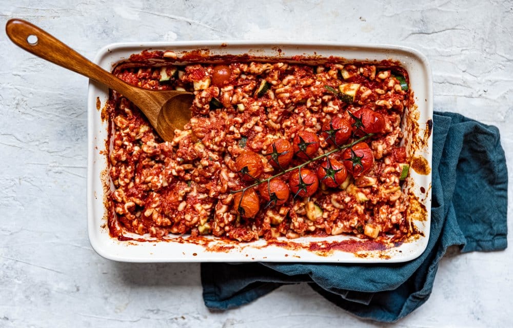 Deze one ovenpot pasta is natuurlijk niet alleen maar makkelijk. ‘T is ook gewoon écht een heerlijk smaakvol maaltje! In de ovenschaal doen we macaroni, tomaatjes, gekruide passata, feta en courgette. De combi van de gesmolten feta met tomaat is zó goed! Dit wil je vanavond voor je neus hebben staan. Natuurlijk kun je nog wat extra groentes of (vega) vlees toevoegen, mocht je dat lekker vinden.